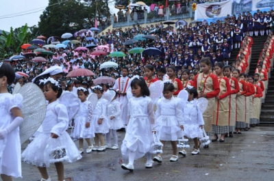 The Community of Bellefonte clearly brought out the sense of the family spirit in the animation of the liturgy. The representatives of the Salesian Family approached the altar with their respective flags. The main celebrant of the Holy Mass, Fr. Edmund Gomes sdb highlighted that the celebration was an occasion to re-commit oneself finding relevance in the present day context. The touching moment of the celebration came when the Daughters of Mary Help of Christians and the Salesian Co-operators renewed their vows around the casket of Don Bosco. The celebration concluded with colourful items by the Sisters, Salesian Co-operators, Past pupils and the young in formation. The culmination of the day was marked by the rendition of “O Qual Sorte!” the FMA Anthem by all the Sisters present. The later part of the day was spent in intimate conversation with the saint during the night vigil together with the educating community. On the following day an emotional farewell was accorded to the relic as it journeyed towards its next destination, Jaintia Hills District of Meghalaya.