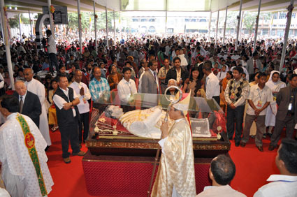 At the very outset the Archbishop greeted the faithful present with his blessings. The grandeur of the day was added with the celebration of the 44th World Communication Day and feast of the Ascension. Don Bosco was an effective communicator of his time. His right hand which is placed inside the relics had produced many books and booklets. Being the world communication day, Archbishop Jala invited everyone to thank God for the gift of this great saint. In the words of the Holy Father, Pope Benedict XVI who said, “We need to reflect seriously on the significance of communication in this digital age”. He further added that the extraordinary potential of the internet and the complexity of its users call us to reflect seriously as they can contribute to the satisfaction of the desire for meaning, for truth and unity which remain the most profound aspirations of each human person. He offered some challenging and thought provoking questions to the people especially the young who are the vulnerable group to this ever growing new technology. He also exhorted them to be imbued with the Goodnews of the Gospel, so that in their seeking to share, to relate, to communicate, they will do so as believers, as apostles even as this Saint has taught his young people to do in his time. After the holy mass the faithful in a prayerful mode paid their homage to the relics of Don Bosco. It was indeed a moving sight as the simple people drew close to receive the saint’s blessings.