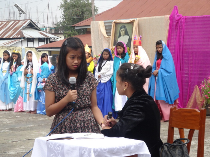 Mazzarello Club was given the chance of animating the programme for the day. It was a very beautiful morning and we started our program by welcoming our chief Guest Sr. Hilda Barragan a veteran missionary. Sir Nathaniel Lyngdoh along with the Mazzarello Club led the gathering into prayer. The students paid floral tribute to Mother Mary and Mother Mazzarello; it was indeed a beautiful scene to behold, students expressed their deepest love to the two giant figures of our School. The different other items consisted of songs, action songs, skit and dance. Sr. Hilda Barragan gave a very inspiring message on ‘3keys’ ‘obedience, love, and discipline’ which we should strive in our lives. Our program got disturb due to a heavy shower and we took it positively as God showering His blessing upon us and so the remaining program was continued the following day which was another beautiful day, the actual day of the death of Mother Mazzarello, perhaps Mother Mazzarello wanted us to honour her on the real day. The skit by Mazzarello club was a thought provoking invitation to everyone to look deeply on one’s own life and the way we deal with the poor and lowly. We do hope and pray that Mother Mary and St. Mary Mazzarello continue to inspire us to be able to emulate their virtues of simplicity, obedience, humility, dedication and deep love for God in our lives.
