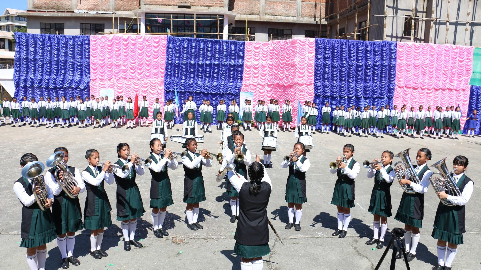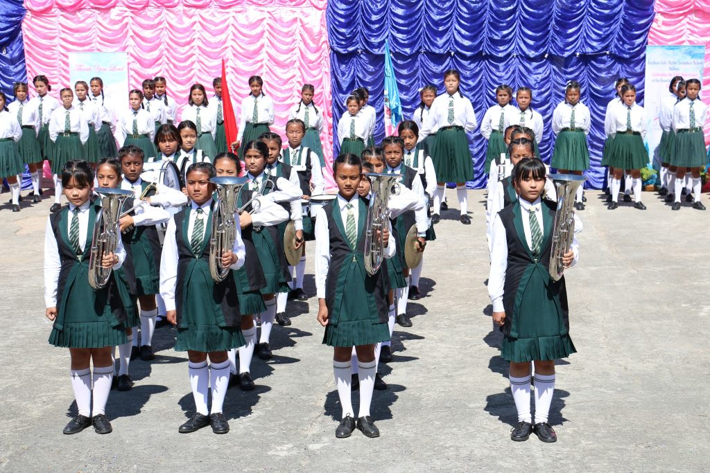 On this happy occasion, the School Band of Auxilium Girls’ Higher Secondary School was inaugurated. The band members spectacularly and harmoniously played five songs to the great admiration and applause of the audience. Another significant performance was the theme song where everyone sang out loud and clear, melodiously and happily waving pink and blue flags of joy and celebration.