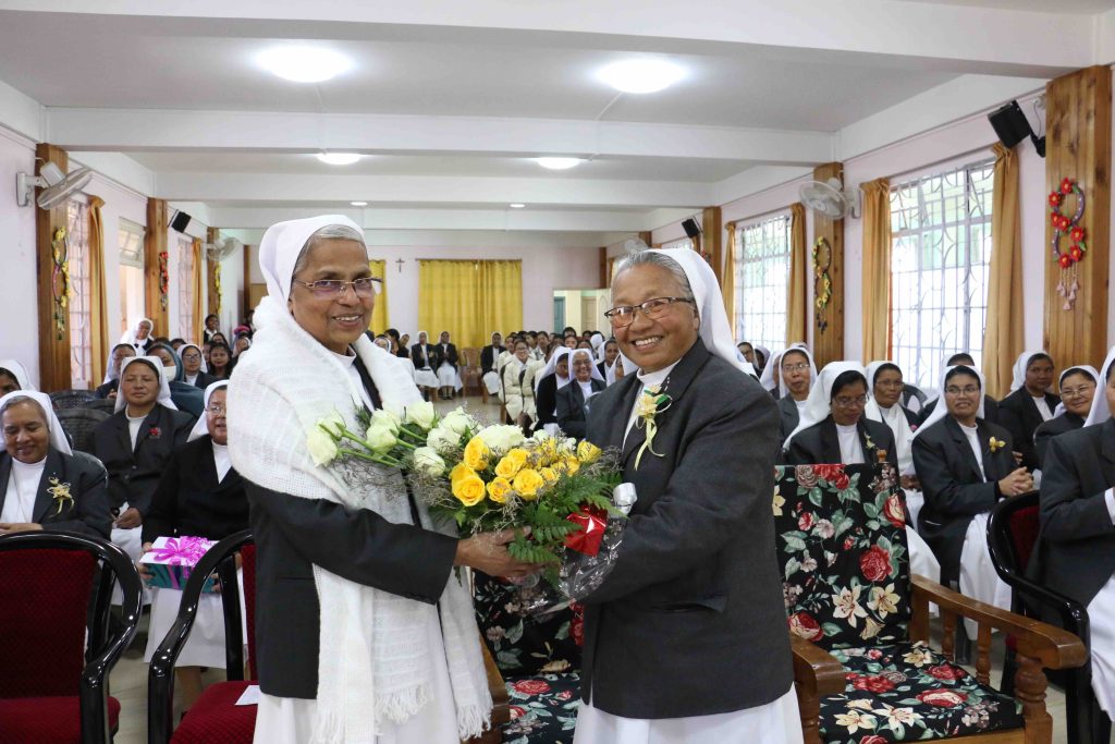 After the celebration of the holy Eucharist, few items were staged by the different representatives of the province as a sign of an external expression of gratitude and appreciation towards Sr. Elizabeth George, the provincial, bond of communion in the province. The programme included an address, felicitation, choreography, songs and above all the theme presentation by the Temporary Professed Sisters who are undergoing their Intensive Juniorate at Auxilium Provincial House, Nongthymmai. In her message to the Sisters, Sr. Elizabeth reflected on “a tree that bears fruit is exposed to many risks”. She encouraged the gathering to bear fruit that will last and thanked them for the wonderful expression of love and unity.