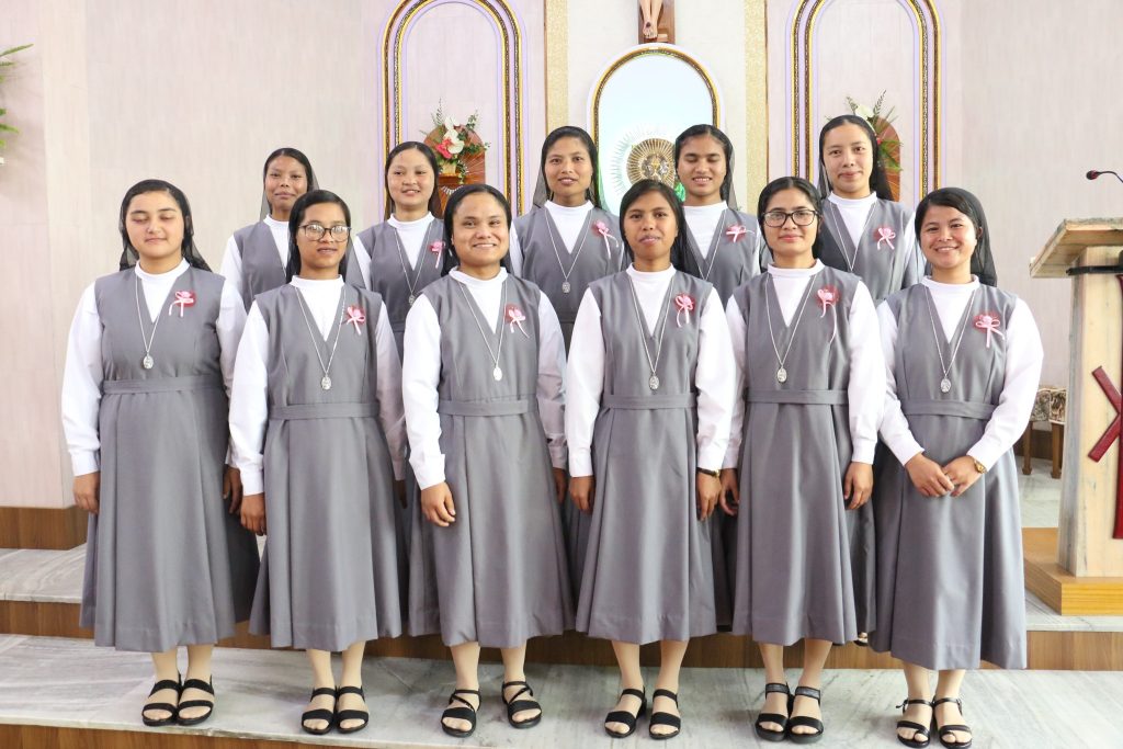 On 3 August 2024, Sr. Elizabeth George the provincial received into the novitiate at Bellefonte Shillong 11 new novices. In the two year of formational journey they will learn the constitutions and assume the FMA lifestyle. 3 other first year novices pursue their novitiate formation at Sacred Heart Novitiate, Nashik in Bombay province.